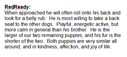 RedReady on left – SOLD – male, at 13 weeks.